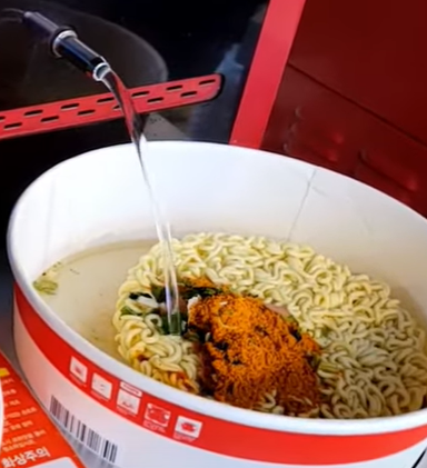 7. 조리시작 버튼을 누르면 라면 용기 위로 물이 알아서 맞춰서 자동으로 나온다.